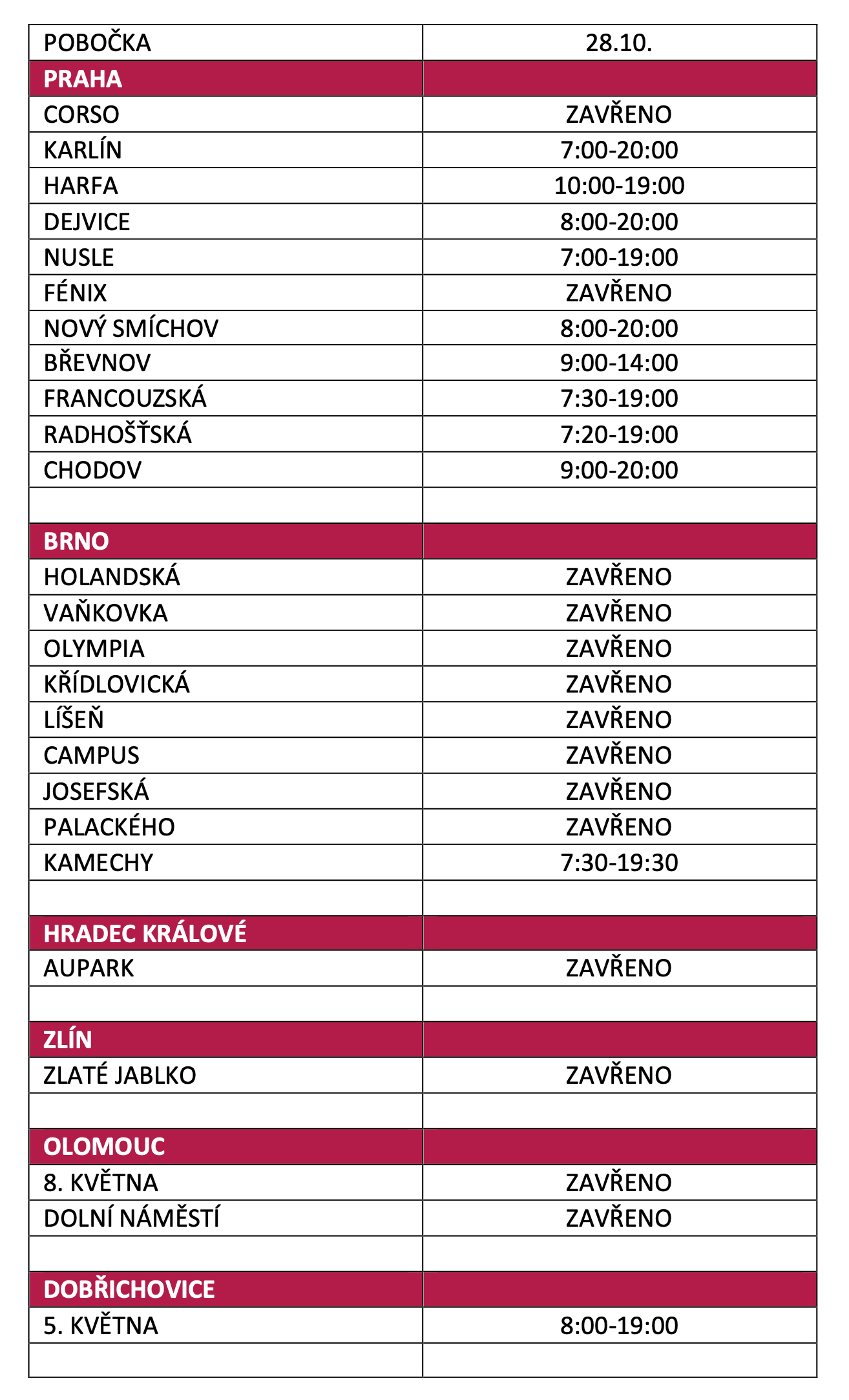 Otevírací doba 28. 10. 2020